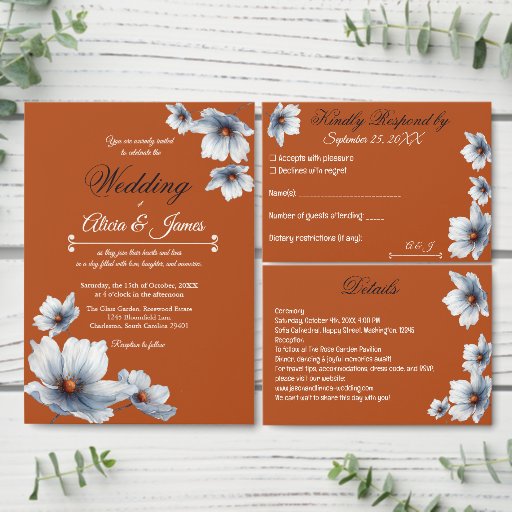 Terracotta Blue Floral Chic Anemone Autumn Wedding Invitation