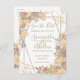A modern boho and elegant floral watercolor save the date wedding invitation party with hand painted terracotta, orange, brown and yellow flowers arrangement and modern and chic script calligraphy with gold glitter confetti with gold geometric frame terrarium.