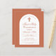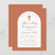 A first communion invitation for a boy. On a modern colour. terracotta brown, it has a white arch with terra cotta text inside. The occasion and the name are written in an elegant calligraphic script; the first line is arched text.