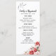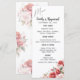 This elegant wedding menu card features a sophisticated botanical aesthetic that balances traditional romance with a clean, modern layout. It is a perfect choice for couples seeking a refined, timeless look for their reception tables. The right side is adorned with a delicate watercolor bouquet of soft pink and white peonies, accented by deep red berries and dusty blue eucalyptus-style leaves.