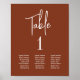A modern and elegant table seating chart in terracotta burnt umber background and a casual script calligraphy lettering of the word "table". Perfect for longer seating arrangements and rustic wood boho theme.