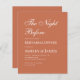 A simple, minimalist terracotta rehearsal dinner invitation. It has just white text on terracotta brown background. The title "The Night Before" is written in an elegant calligraphic script. The text is left aligned.