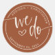 Handwritten calligraphy script with the phrase "we do" with long swashes on the ends of the letters.  Shown in cream coloured text on a terracotta background.  Complements my wedding collection.  Personalise the template with your names and wedding date.  © Kimbellished, LLC