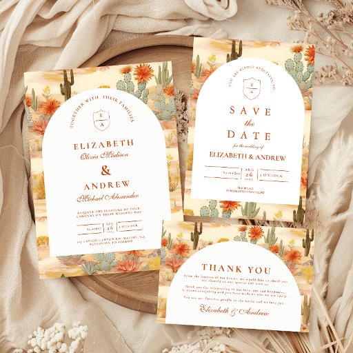 A refined western-inspired design featuring warm desert florals, cacti, and earthy botanicals arranged in a rich, painterly composition. The arched layout adds a timeless architectural feel, balancing the bold surrounding pattern with a clean, elegant centre. Terracotta tones, soft neutrals, and muted greens create a grounded yet romantic palette—perfect for a modern desert or western celebration. Ideal for couples who want something unique, artistic, and effortlessly sophisticated.