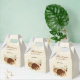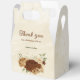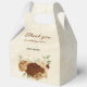 Beautiful earth tone fall wedding favour box featuring terracotta, beige and cream flowers with green leaves .