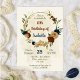 Beautiful earth tone fall birthday party invitations featuring terracotta, beige and navy blue flowers with green leaves .
