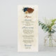 Beautiful earth tone fall wedding menu card featuring terracotta, beige and navy blue flowers with green leaves .