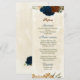 Beautiful earth tone fall wedding menu card featuring terracotta, beige and navy blue flowers with green leaves .