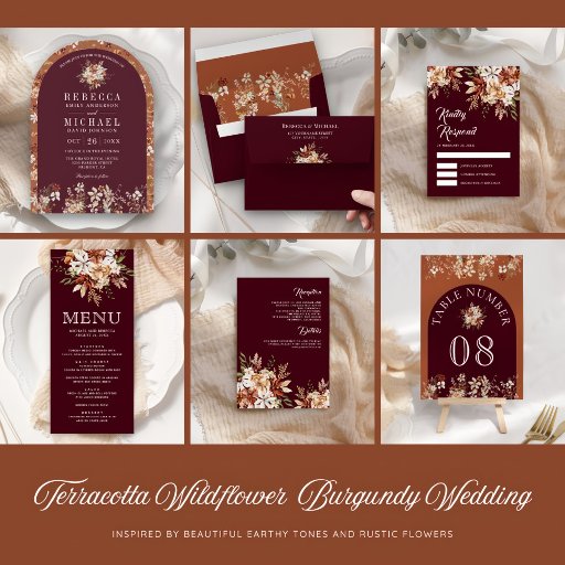 Terracotta Floral Wildflower Burgundy Arch Wedding Invitation