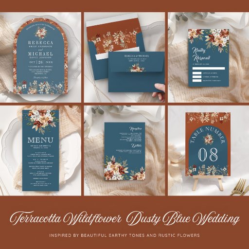 Terracotta Floral Wildflower Dusty Blue Wedding All In One Invitation