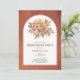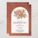 Terracotta flowers and pumpkin fall engagement party invitation. This lovely wedding design features an arch frame on terracotta stained background. In the frame there is a bouquet of terracotta flowers and a pumpkin.