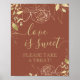 This poster design features gold peonies and foliage in a modern, minimal line drawing style on a solid background. "Love is Sweet Please Take a Treat!" is in the matching gold featuring a handwritten cursive typography. This sign is the perfect way to let wedding or shower guests know where to pick up their sweet treats.