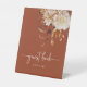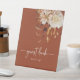 Terracotta Guest Book sign. Encourage your loved ones to leave heartfelt messages with this guest book tabletop sign, beautifully decorated with hand-painted terracotta and burnt orange leaves, cream dahlias, and copper-toned roses on a warm copper background. A lovely addition to your welcome table, this sign adds charm and makes signing the guest book feel extra special—customise it now.
