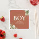 It's a boy baby shower napkin featuring elegant typography and pretty botanical greenery foliage on a terracotta background. Designed by Thisisnotme©