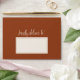 An elegant terracotta-coloured envelope that perfectly coordinates with my wedding collection. Handwritten calligraphy with the phrase "kindly deliver to" appears on the front with a light-coloured text box to add your guests' names and addresses. Personalise the back flap of the envelope with the couple's initials and return address. © Kimbellished, LLC
