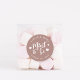 Punny wedding favour stickers feature "mint to be" in white hand lettered script accented with hearts, on an earth tone terracotta background. Personalise with your names and wedding date.