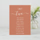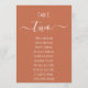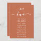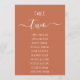 In the upper part, there is the table number written in a handwriting script and the word Table above, in smaller caps (hand letters). Under them, there are the 10 guest names, in similar hand letters. The background is terracotta (a modern shade of brown), all text is white.