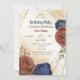 Beautiful earth tone fall birthday party invitations featuring terracotta and navy blue flowers with green leaves . The gold glitter details are simulated. FOR MORE MATCHING PRODUCTS click on the collection above or contact me