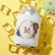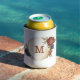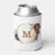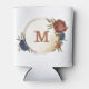 Beautiful earth tone monogram can cooler featuring terracotta and navy blue flowers with green leaves .