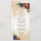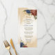 Beautiful earth tone fall wedding menu card featuring terracotta and navy blue flowers with green leaves . The gold glitter details are simulated.
