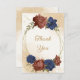 Beautiful earth tone fall wedding thank you card featuring terracotta and navy blue flowers with green leaves . The gold glitter details are simulated.