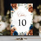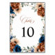 Elegant Navy blue, Terracotta , Orange earthy floral theme wedding table number card featuring elegant bouquet of Navy blue, Terracotta colour roses peonies and green eucalyptus leaves. Please contact me for any help in customisation or if you need any other product with this design.