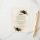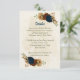 Beautiful earth tone fall wedding reception details enclosure card featuring terracotta, beige and navy blue flowers with green leaves .