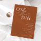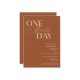 Minimalist wedding rehearsal dinner invitation featuring typography text that says "one more day." The background is terracotta.