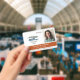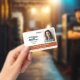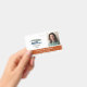 Horizontal employee ID badge personalised with photo and logo, name and title, and badge number and expiration date. Add name and title in white on burnt orange.