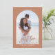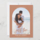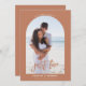 This terracotta photo nothing fancy just love wedding invitation is perfect for a classic wedding. The design features an elegant calligraphy font with an arch photo in a terracotta background.