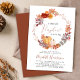 An autumn-themed baby shower invitation featuring a rustic wreath composed of watercolor illustrations of pumpkins and terracotta, burnt orange and sage green florals and greenery, and "a sweet little pumpkin is on its way" written in a mixture of simple typography and a stylish terracotta script with a heart swash. Specify the baby's gender if desired (e.g., "is on his way").