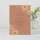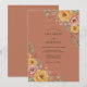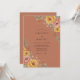 A warm terracotta background is paired with soft floral accents. Watercolor roses in golden yellow and dusty pink bloom across the design, accented by sage green eucalyptus and rust foliage. This earthy palette creates a moody, romantic atmosphere for a harvest theme. These rich botanical elements provide a sophisticated and natural look.