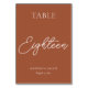 Modern table numbers elevate your wedding reception table décor. The design features an elegant script font in white on a burnt orange earth tone background perfect for a fall wedding or banquet event. Order each table number from the collection or edit this card for each number needed. The design is printed on both sides.