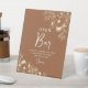 Elegant, modern, boho, rust orange terracotta wedding Open Bar pedestal sign with gold floral lace and simple calligraphy script.