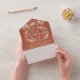 All in one wedding invitation featuring pretty string lights, hand-drawn floral garland and chic typography on a terracotta background. The invitation includes a perforated RSVP with your wedding website QR code and details. Designed by Thisisnotme©