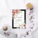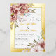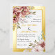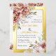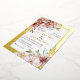 Floral real gold foil wedding invitation with terracotta watercolor flowers. On the corners, there are bouquets of flowers in terracotta brown tones, and your text is set in a white frame with a gold foil border. Floral garlands adorn the upper and lower portions of the back.