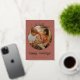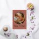 A modern gold foil holiday card with your favourite photo in the centre of circle ornament shape topped with a whimsical hand drawn bow, on an editable terracotta background. The editable "happy holidays" greeting is in gold cursive font. Sign off with your name in sans serif font and add a personalised message to the reverse.