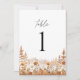 This terracotta wildflower table number features a refined serif numeral paired with soft hand-painted florals inspired by mountain meadows.
