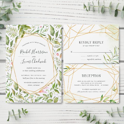 Seal your invitation envelopes or favours with these elegant botanical wedding stickers featuring your names framed by golden geometric elements and lush greenery in shades of forest green and fern. Coordinates with our Terrarium wedding collection.