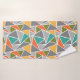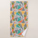 This towel set has a light grey washcloth, a darker grey hand towel, and a bath towel with a mid-century modern design of triangles making a terrazzo floor look, in greys, turquoise, orange, gold, and green.