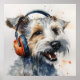 Unleash a high-energy, rhythmic vibe in your home with this Custom Terrier Music Factory Headphones Poster. Featuring a scruffy, joyful terrier wearing vibrant orange over-ear headphones, this piece is rendered in a lively watercolor style with expressive blue and orange splatters. Perfect for a modern living room, a pet-friendly office, or a stylish nursery, this high-quality print captures the spirited and happy personality of the breed with a cool musical twist.