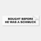 This is a black and white bumper sticker for a Tesla, that says I bought before he was a schmuck. It is easy to customise to your own saying.
