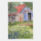 A watercolor painting by artist D. Carrasco of a Texas barn in the spring surrounded by bluebonnets.