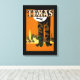 Vintage poster image of Texas word art, cowboy illustration, and city background. Colours are earth tones
