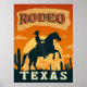Capture the Wild West spirit with this vintage poster featuring a classic silhouette of a Texas cowboy on horseback, riding into the sunset in front of a majestic cactus. Perfect for collectors of rodeo memorabilia or anyone who loves a touch of Western flair.
