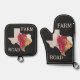 Farm and ranch roads cover the great state of Texas, and the signs marking those roads are a familiar sight. This sign combines that text with the state shape filled with a watercolor chicken and wire fencing. The background is a textured mix of dark greys. Check out other options with a cow, horse or pig. Matching products available.
