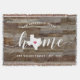 Show some home state pride with this cute rustic faux wood plank throw blanket featuring "home" in white calligraphy script lettering with a silhouette map of the state of Texas standing in for the letter "O." A pink heart illustration inside the state map completes the design; you can change the position of the heart to your home city by opening the design tool and dragging the heart shape to your favourite spot. Personalise with your home city, family name and year established to create a perfect and memorable housewarming gift or addition to your new home.
