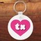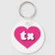 This key chain features a vibrant hot pink heart containing the bold, white, rounded, lower case letters tx, a playful abbreviation for Texas, the lone star state.