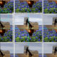 Pump jack pumping oil at sunset made into the shape of Texas on a background of bluebonnets and blue sky printed on fabric.