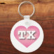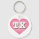 This key chain features a calm, cool pink heart with a white-washed centre containing the bold, white, upper case letters TX, the official abbreviation for Texas, the lone star state.